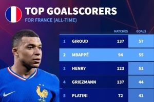 - 还差2球!法国队史射手榜:吉鲁57球居首,姆巴佩55球次席