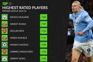 WhoScored本赛季英超评分榜:哈兰德7.90居首,扎卡7.37第二